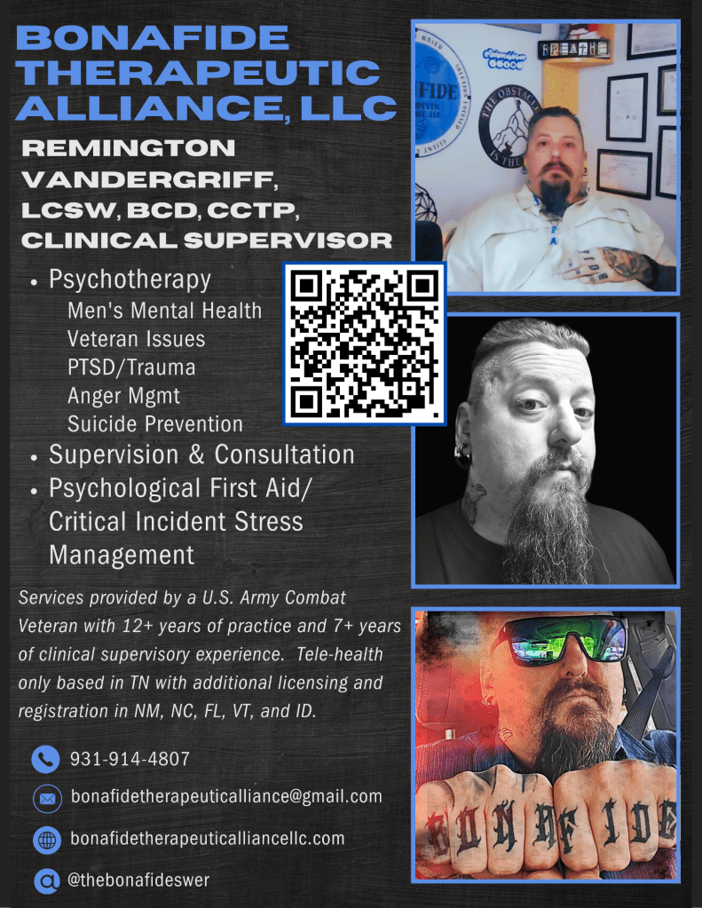 Combat Veteran-owned telehealth psychotherapy in TN, NM, NC, FL, VT, & ID. LCSW supervision in TN, NM, & NC. Sliding scale, prepay discounts, & many insurances accepted. Author of therapeutic resources. #MensMentalHealth #VeteranIssues #LCSWSupervision