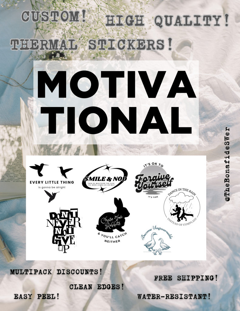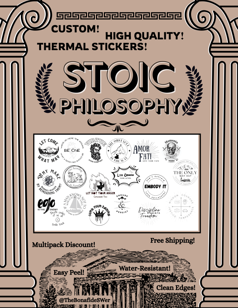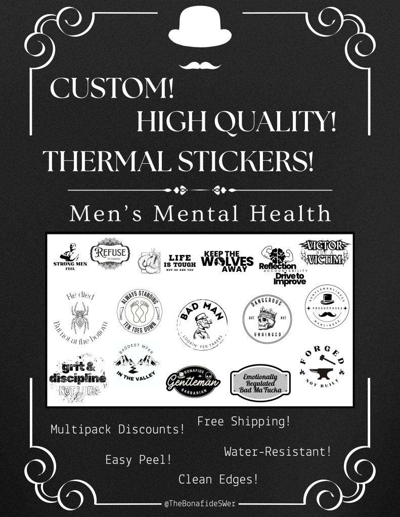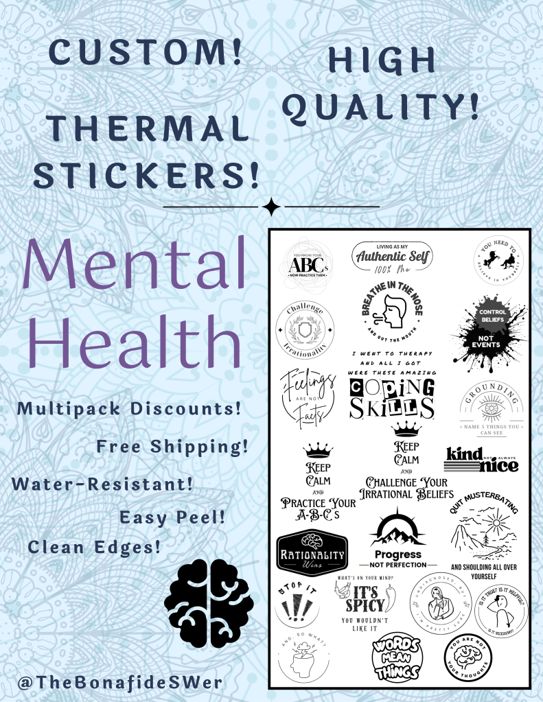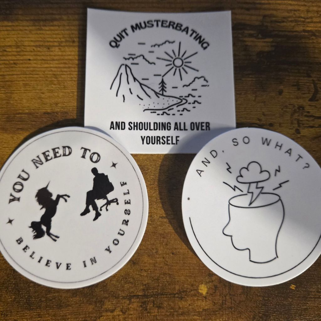 I’ve also started creating mental health and philosophy related designs for stickers, decals, and laser engraving. Just these stickers so far, but follow the shop, lots of items are forthcoming.